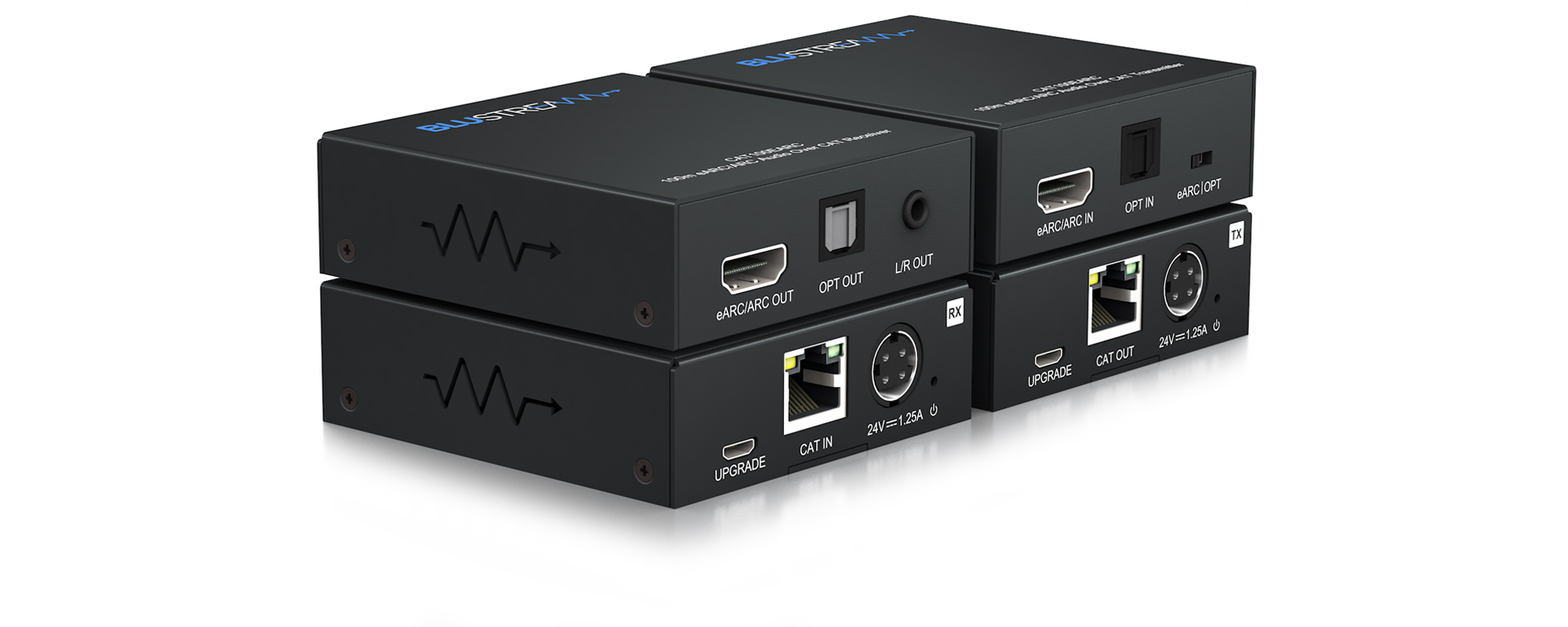 Our CAT100EARC Audio over CAT cable extender transmits HDMI eARC/ARC or optical digital audio signals up to a distance of 200m (eARC/ARC signals up to 100m).