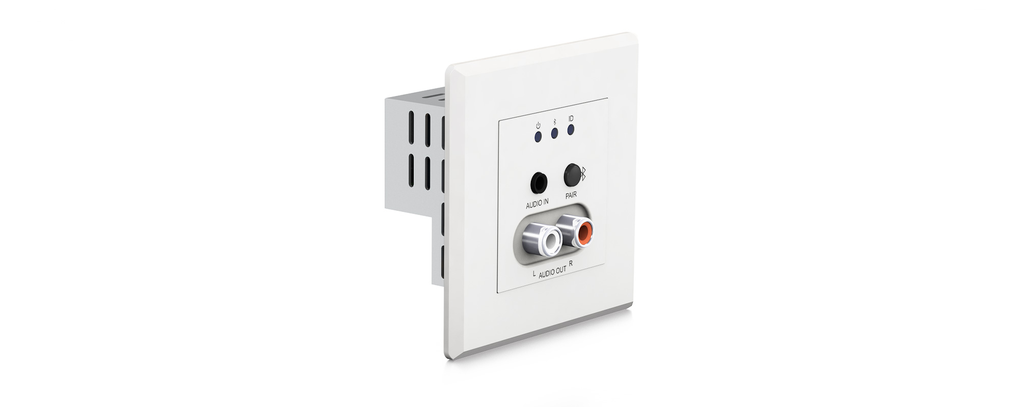 • Dante® network wall plate interface for Bluetooth and analogue L/R audio inputs, and L/R audio outputs