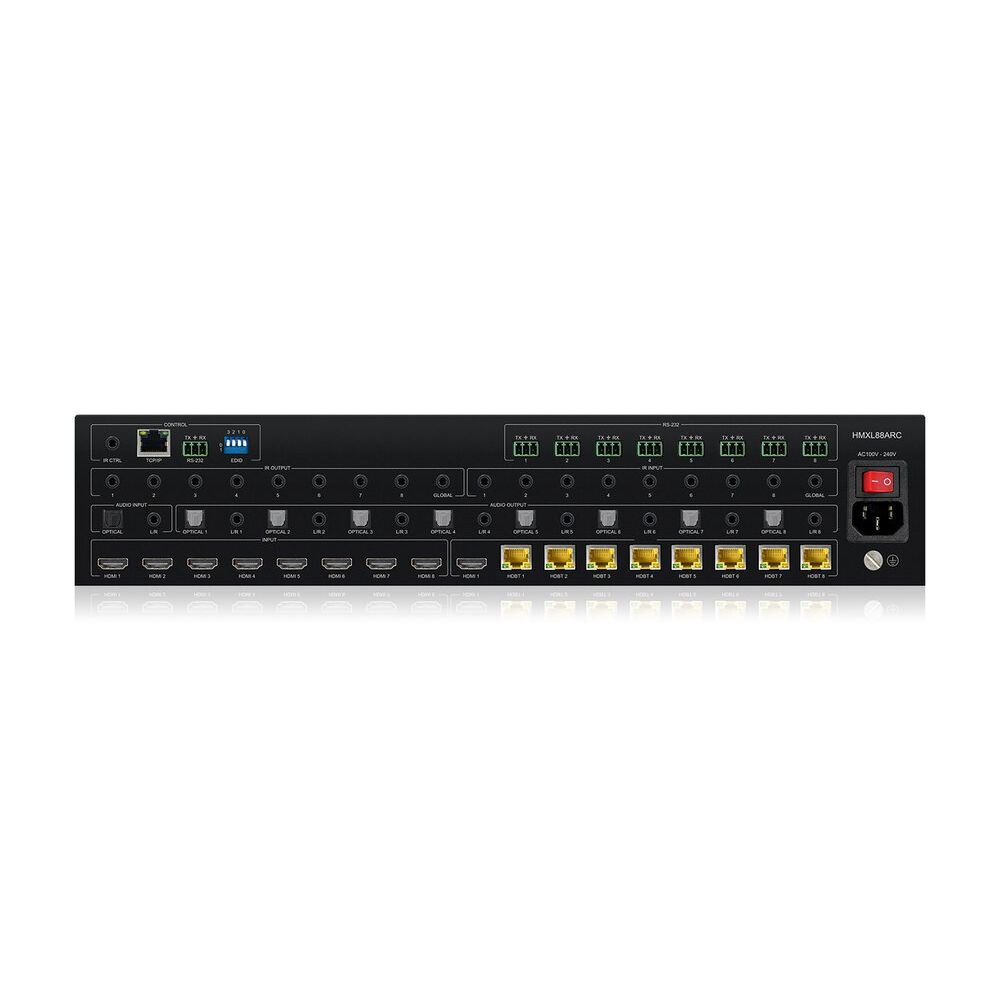 The HMXL88ARC features enhanced audio routing via an integrated 26x8 audio matrix. This enables the audio both from displays and sources, to be embedded and routed through the system at the users discretion.