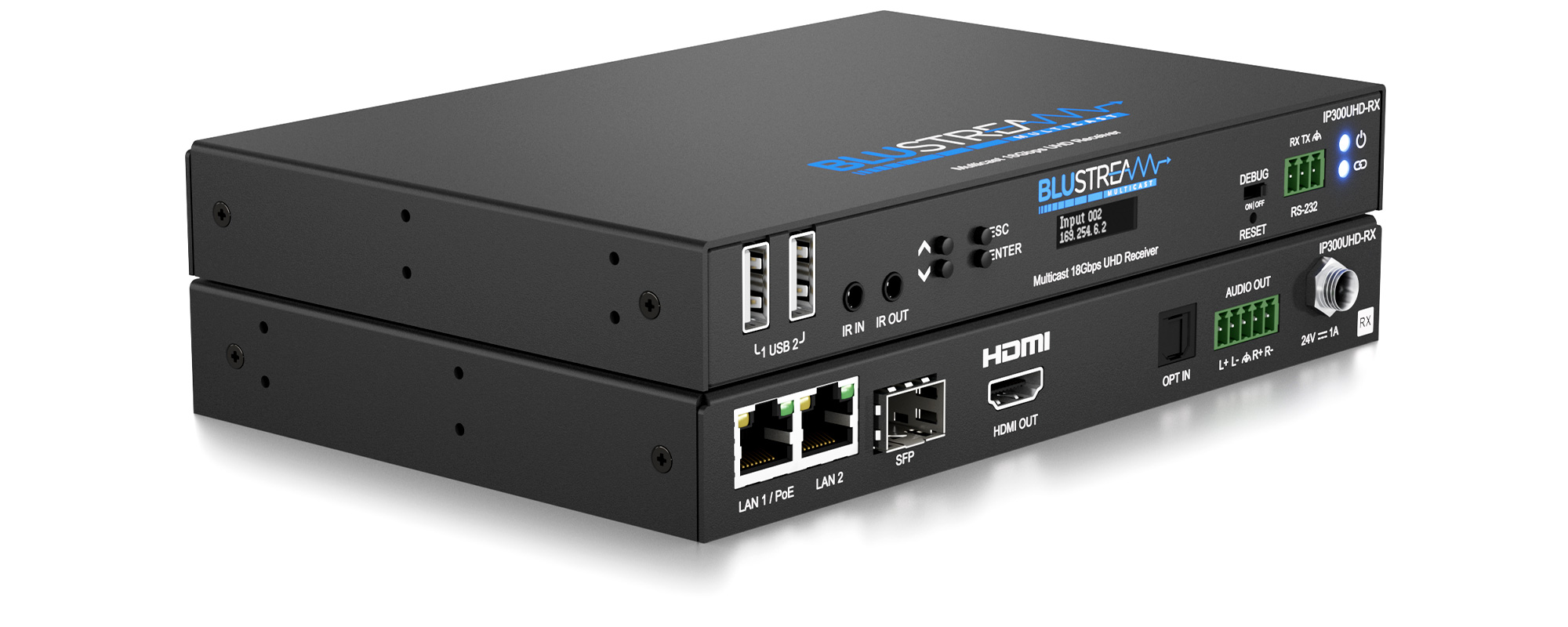 The Blustream IP300 series Multicast distribution platform allows virtually latency free (1 frame) distribution of 4K 18Gbps HDMI video over a 1Gb managed network.