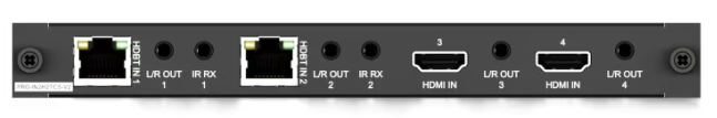 The PRO-IN2H2TCS-V2 board features 2 x HDBaseT™ and 2 x HDMI 2.0 inputs utilising CSC technology allowing support of HDMI 2.0 4K 60Hz 4:4:4 (18Gbps) HDCP 2.2 signal distribution up to lengths of 100m (4K 70m). The four sources can be independently routed to any HDMI / HDBaseT™ output board. The HDBaseT™ inputs include IR distribution to allow source control at each connected HDBaseT™ Transmitter. Each source input includes an independent fixed level 2ch analogue audio breakout and features quick release card module fittings allowing simple installation into the Custom Pro Matrix hub.