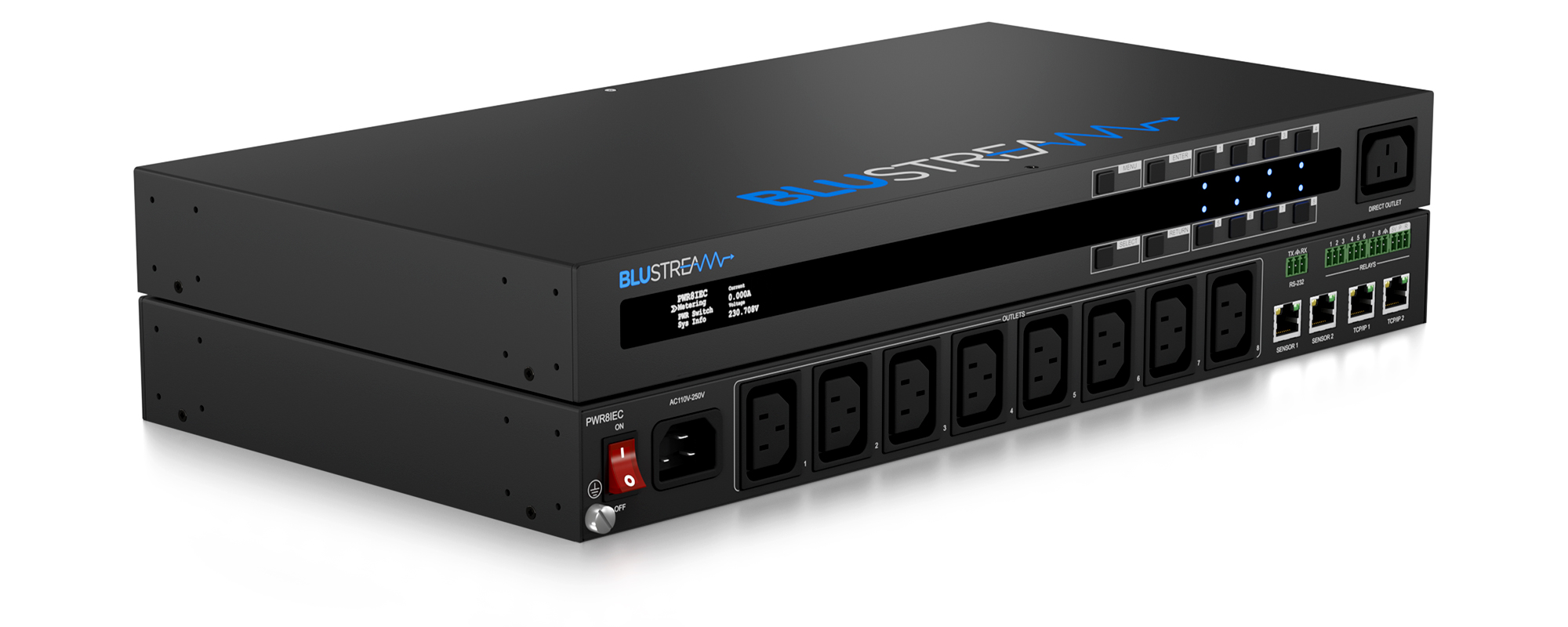 The PWR8IEC is an outlet-level metered and switched smart PDU. The unit features 1 x IEC C14 inlet for power, and 8 x IEC C13 output outlets for controlled supply to high-power consumption devices, and a single non-controlled outlet. The PDU supports TCP/IP and RS-232 control, and a redundant TCP/IP port as a back-up. Front panel buttons for manual switching of power to individual outlets, and a single mains switch for overall system power. Relay connections (x9), and 2 x sensor ports can also be used for automatic control of power to both inlet and individual outlet stages when triggered from 3rd party control platforms or BMS systems. Remote access and monitoring can be set-up and achieved via the web-GUI.
