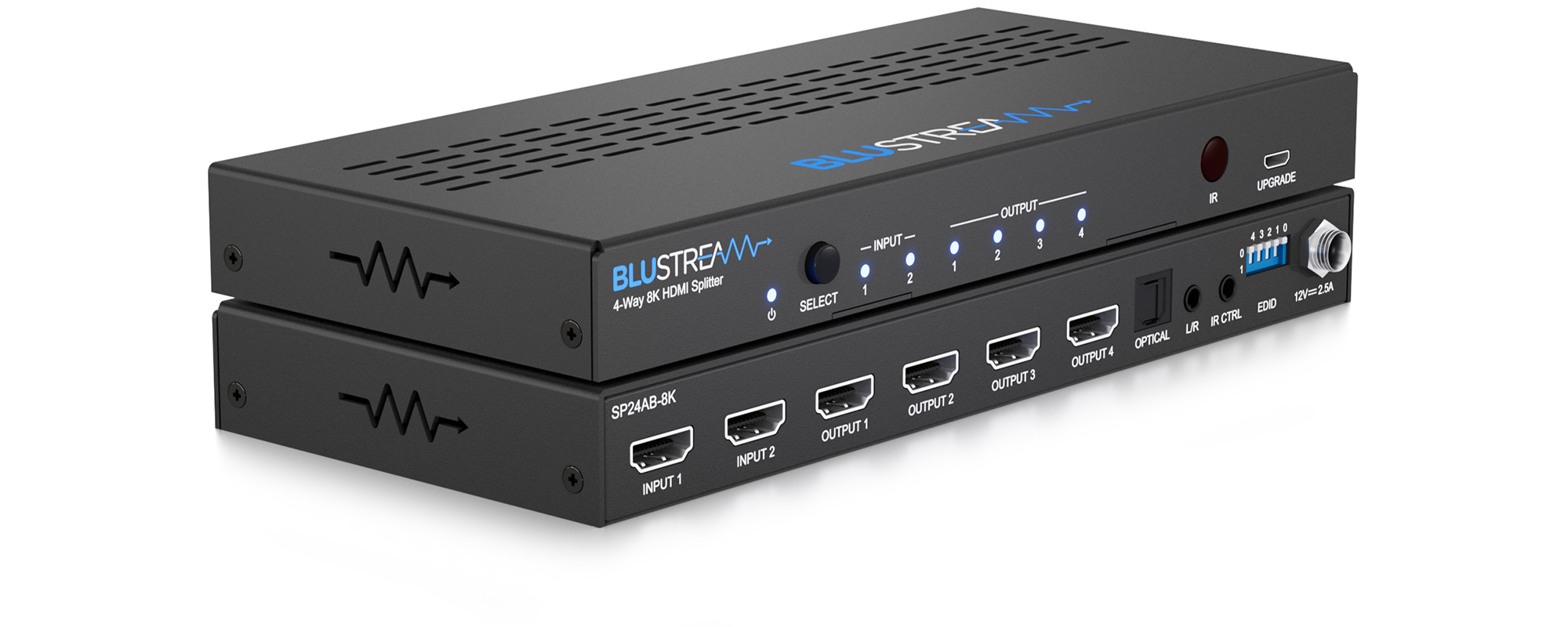 The SP24AB-8K HDMI 2.1 splitter is designed to be used where HDMI 2.1 chipset are being utilised for signals up to 8K 60Hz and 4K 120Hz. With selection of 2 x HDMI 2.1 input sources; a single source can be distributed to up to 4 x outputs simultaneously; the SP24AB-8K can auto-switch based on detecting a 5V hot plug; a new TMDS signal; or manually using IR or the front panel. Analogue and coaxial digital (S/PDIF) audio breakout allows for audio integration; HDCP2.3 compliant; and advanced EDID management.